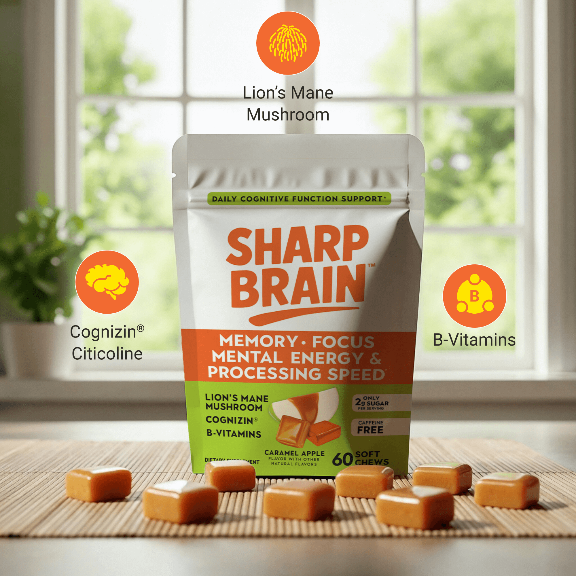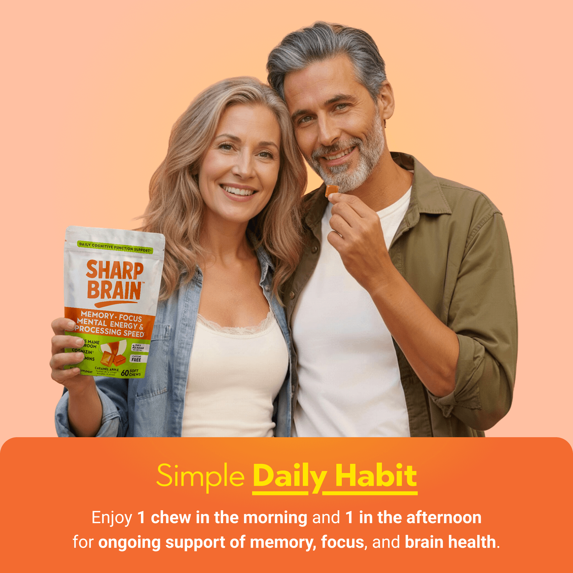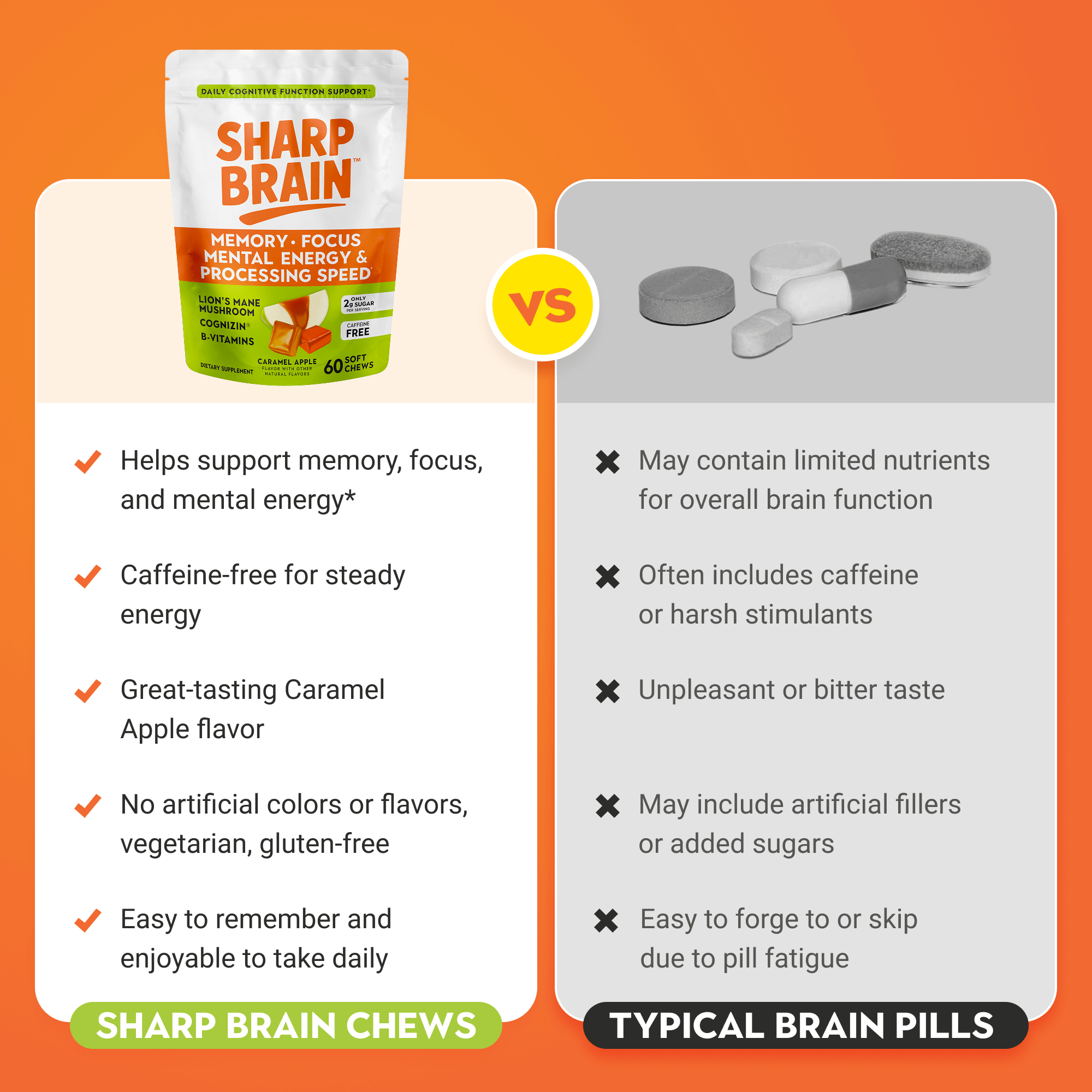 Sharp Brain Chews are delicious caramel apple soft chews formulated with clinically researched ingredients to support memory, focus, mental energy, and long-term brain health. Each chew contains Cognizin® Citicoline, organic Lion's Mane mushroom, and essential B-Vitamins—all in a pill-free format you'll actually look forward to taking daily.*