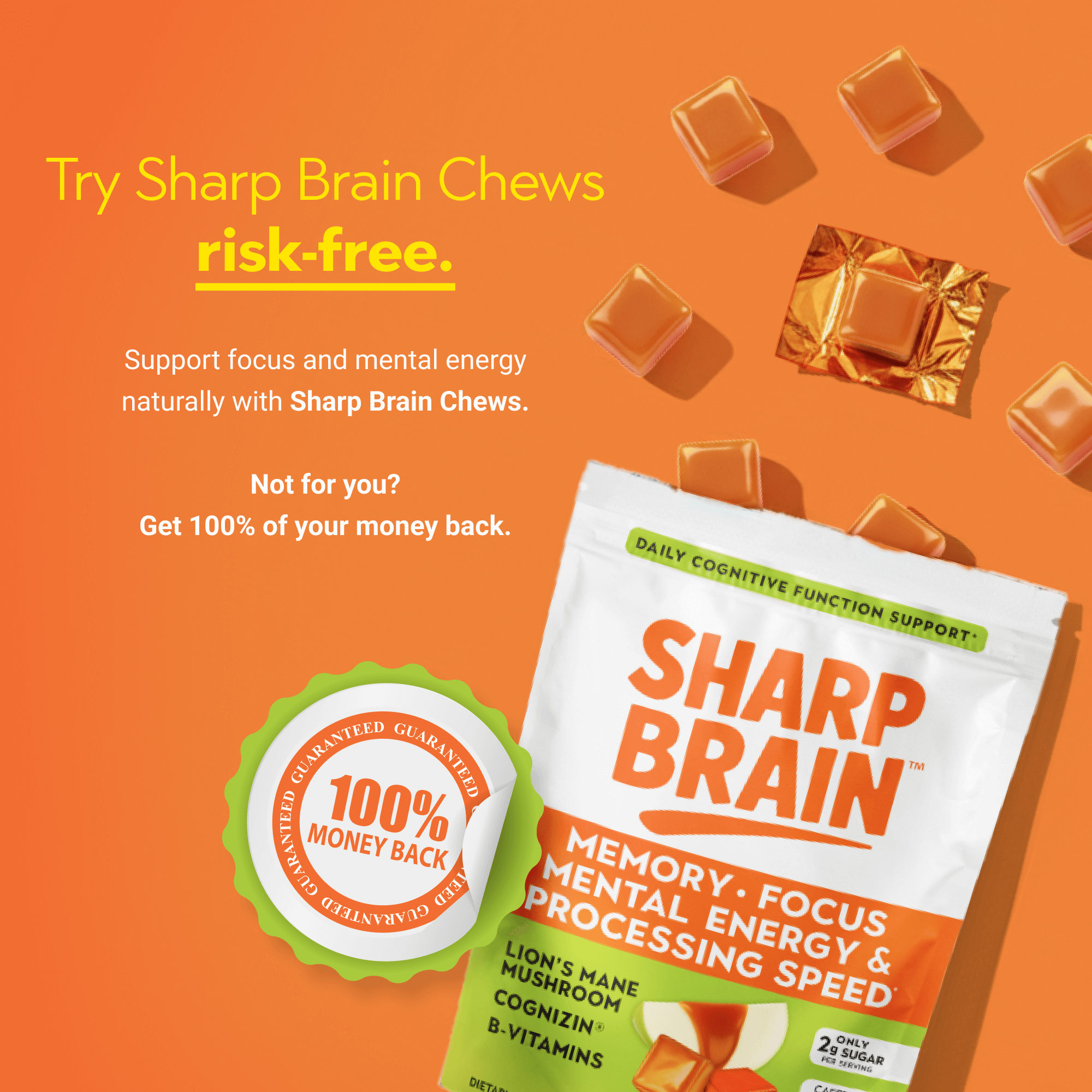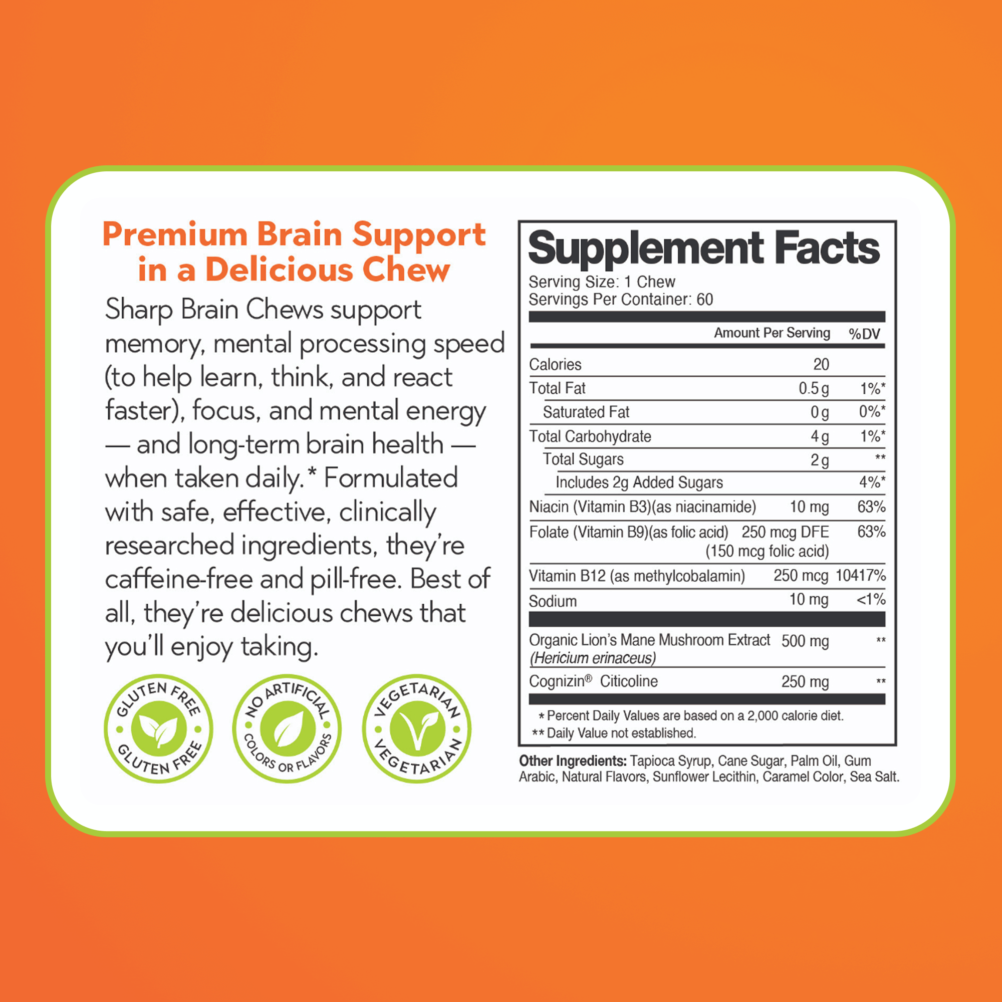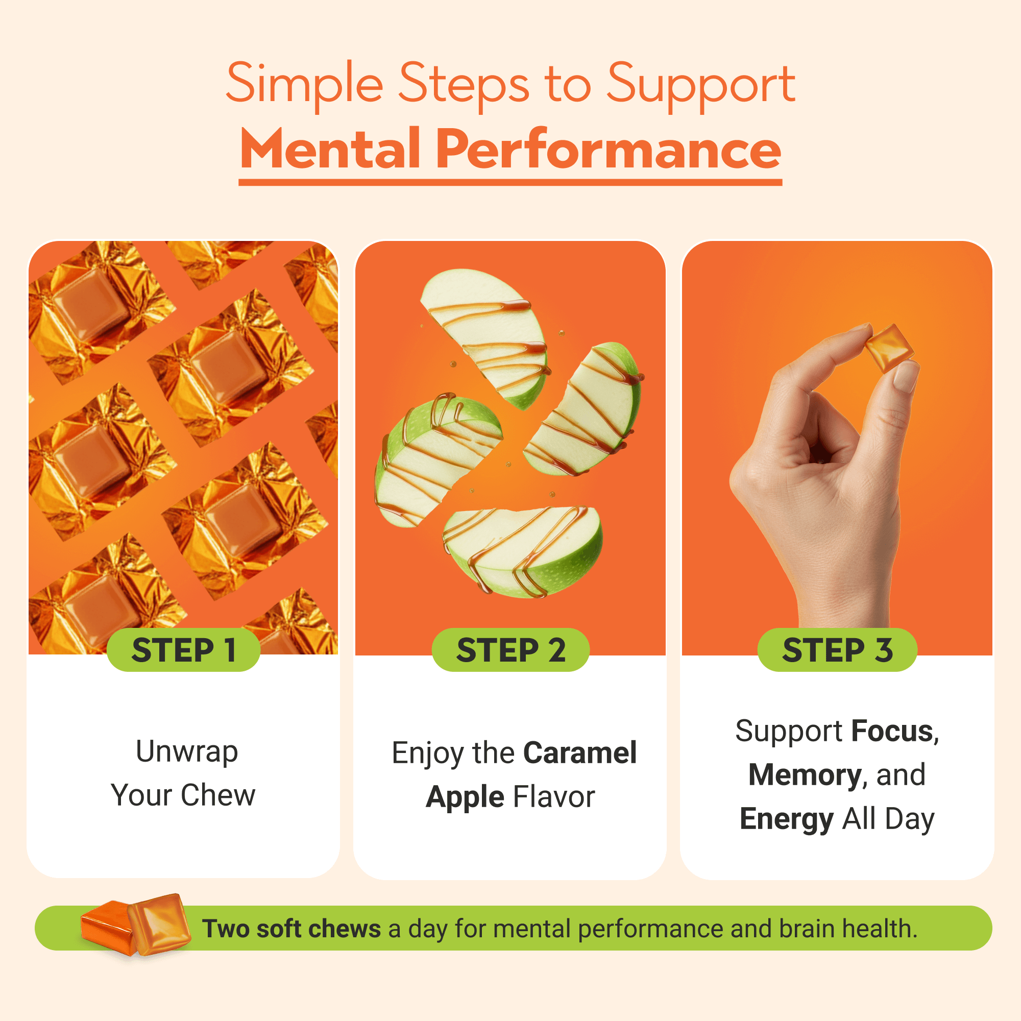 Sharp Brain Chews are delicious caramel apple soft chews formulated with clinically researched ingredients to support memory, focus, mental energy, and long-term brain health. Each chew contains Cognizin® Citicoline, organic Lion's Mane mushroom, and essential B-Vitamins—all in a pill-free format you'll actually look forward to taking daily.*