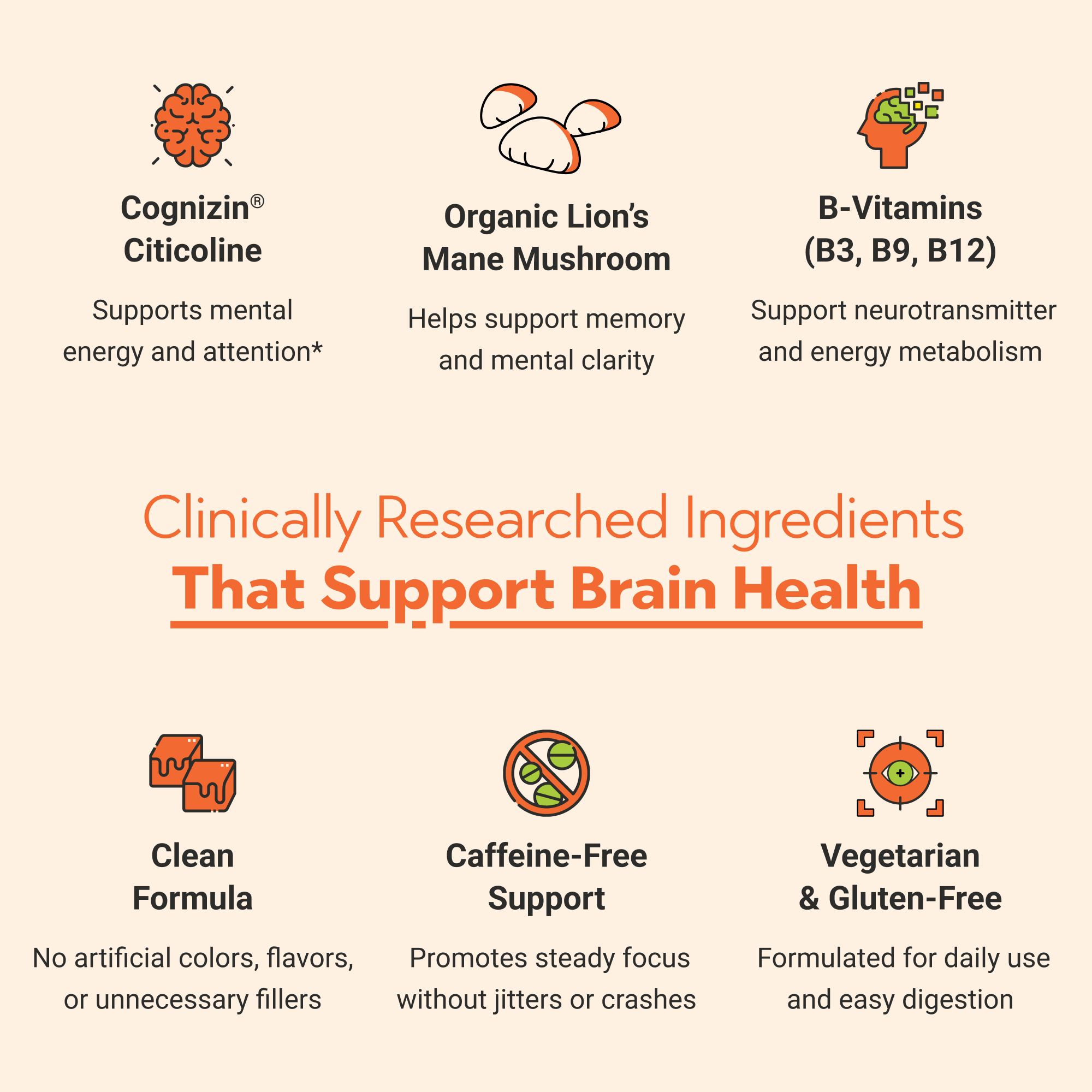 Brain support without the pills. Each delicious chew delivers Cognizin® Citicoline, organic Lion's Mane, and essential B Vitamins to support memory, mental clarity, and cognitive function.*